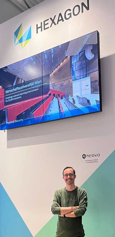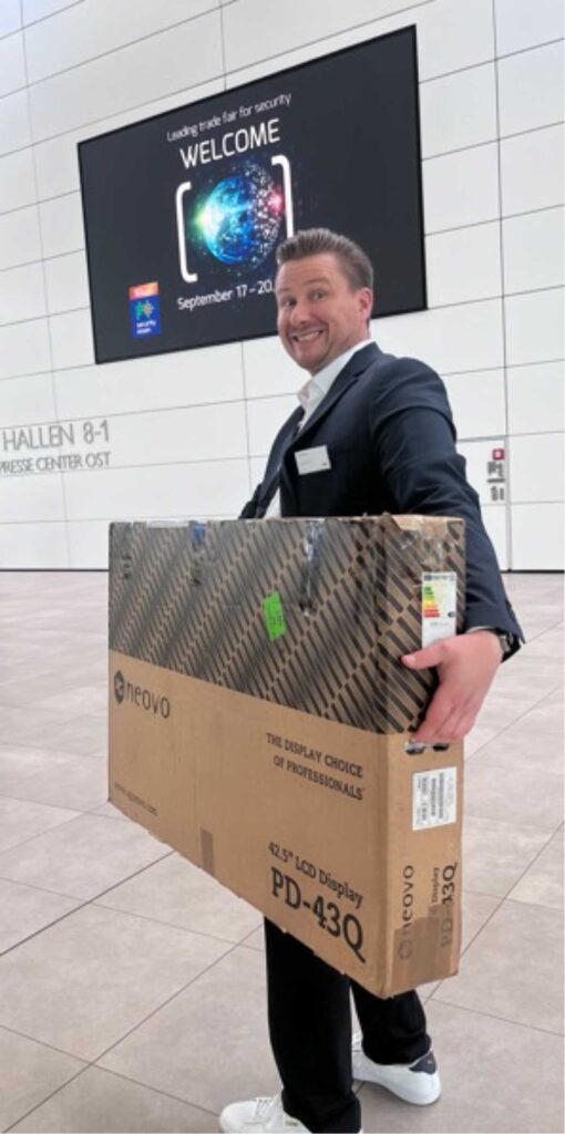 Finally, we’d like to mention a lighthearted example of AG Neovo’s professional displays being used unexpectedly. Our partner Dallmeier was mistakenly supplied with a low-quality TV by the exhibition contractor. Anyone familiar with Dallmeier knows this is a “no go” for premium 4K video images. After reporting the issue the evening before the event, Niklas Beste was on-site by midday of the first day with a perfectly suitable PD-43Q for Dallmeier Manager Kai Gronauer. Another happy partner in the AG Neovo network!