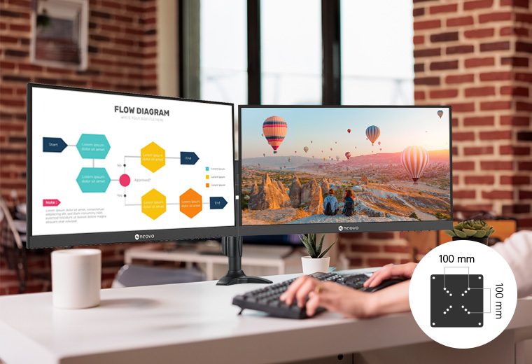 Le moniteur est compatible avec le standard VESA 100 x 100 mm, offrant des options d’installation variées selon l’espace de travail. Son inclinaison réglable de -5° à 20° garantit un angle de vision personnalisé.