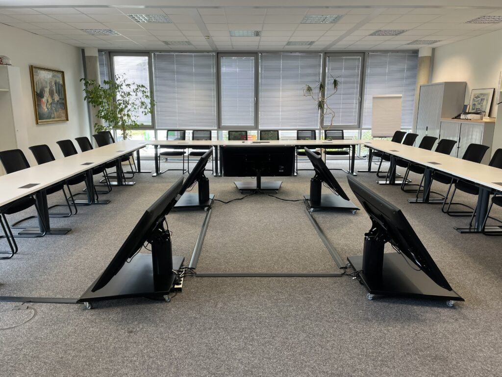 Dank der geringen Standhöhe und der Möglichkeit der Neigung wurde hier, auch durch die schmalen Monitorrahmen, eine schicke und leistungsstarke Lösung gefunden, die beim Kunden viel Anklang gefunden hat. Diese Lösung erlaubt einen besseren Dialog innerhalb der Tischanordnung und bietet nun die synergetische Unterstützung medialer Inhalte oder Anbindung externer Konferenzteilnehmer.