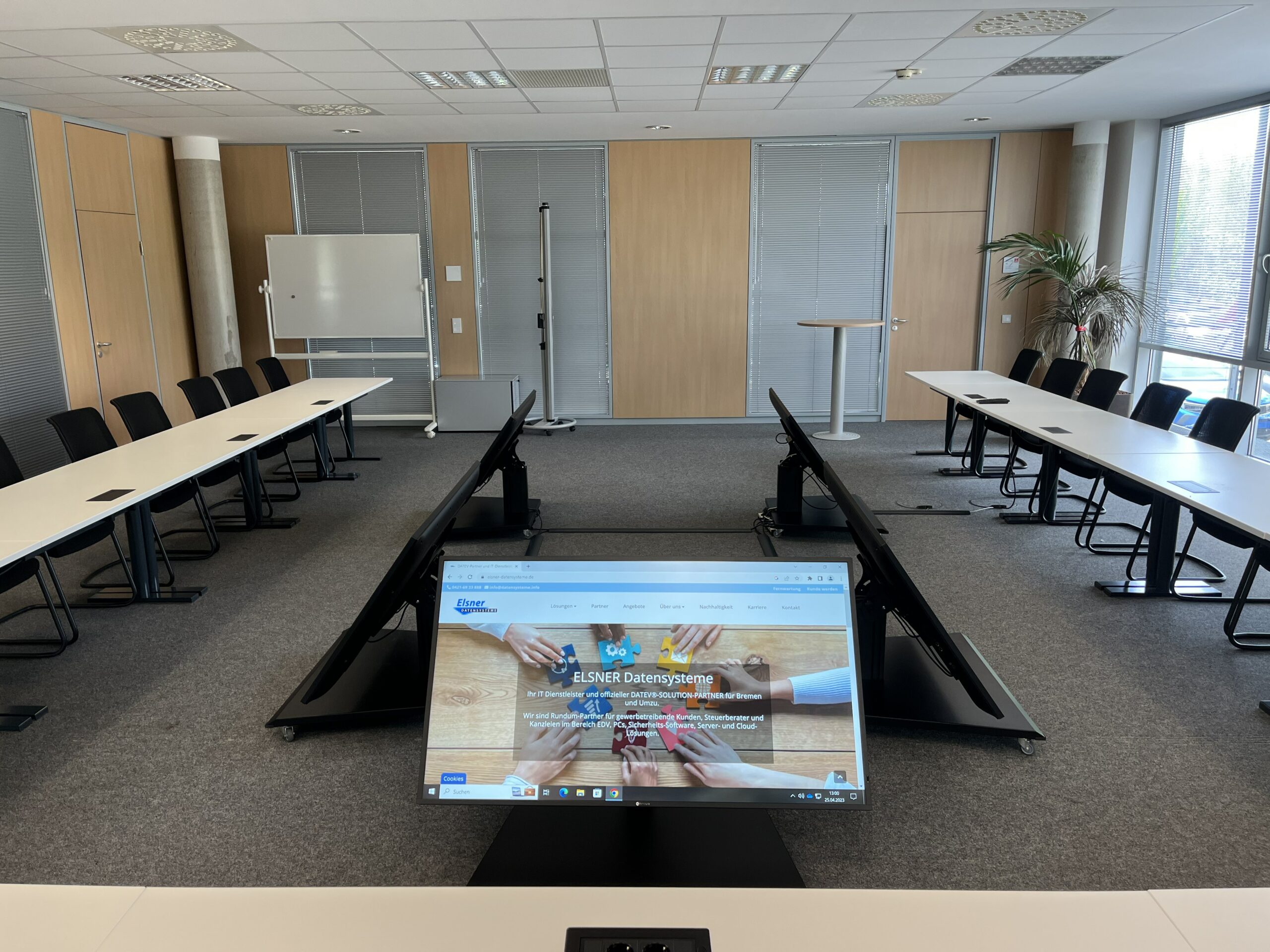 Translation: Thanks to the low stand height and tilting capability, a stylish and powerful solution was found, which has been very well received by the customer. This solution allows for improved dialogue within the table arrangement and now offers synergistic support for media content or the inclusion of external conference participants.