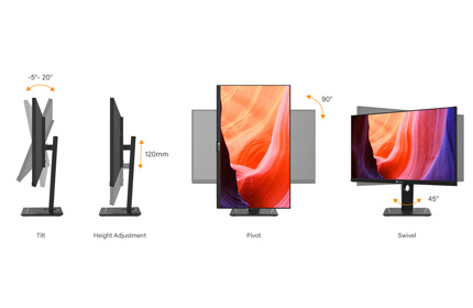 The ergonomic stand allows for adjustable tilt, swivel, pivot, and height, ensuring comfort during long work sessions.