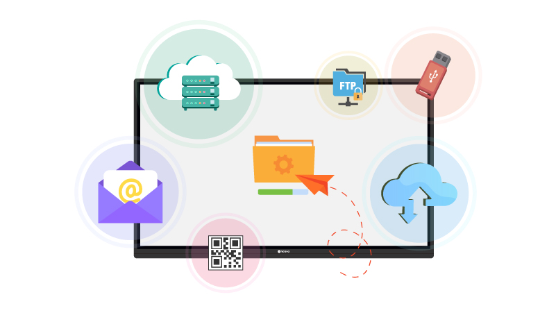 忙碌的專業人士可以透過簡化檔案傳輸、分享的流程節省會議時間。例如,利用雲端儲存解決方案即時存取或共享會議檔案,藉此能夠減少與會者受到干擾和提升協同合作的能力。有了一台 Meetboard 互動式電子白板,檔案管理變得更加輕而易舉。透過 USB 隨身碟、雲端硬碟和 Samba 網路芳鄰等方式從檔案管理員中迅速存取、儲存和共享文件。至於沒有筆記型電腦的與會者,Meetboard 也能透過利用手機掃描 QR 碼的方式共享會議結果。
