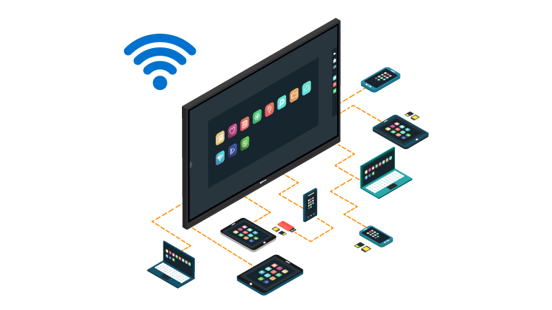 Meetboard 互動式電子白板搭載無線投影的簡便性,徹底改變了會議前置作業。不再需要多花幾分鐘時間整理各種傳輸線 — VGA、HDMI、DisplayPort,只要搭配 Airplay、Miracast 和 Chromecast 無線投影技術支援,Meetboard 無需多條傳輸線,提供無線連接性。更棒的是,只要 Meetboard 和個人裝置共用同一個 Wi-Fi 網路,最多可讓 9 個裝置同時連線。
