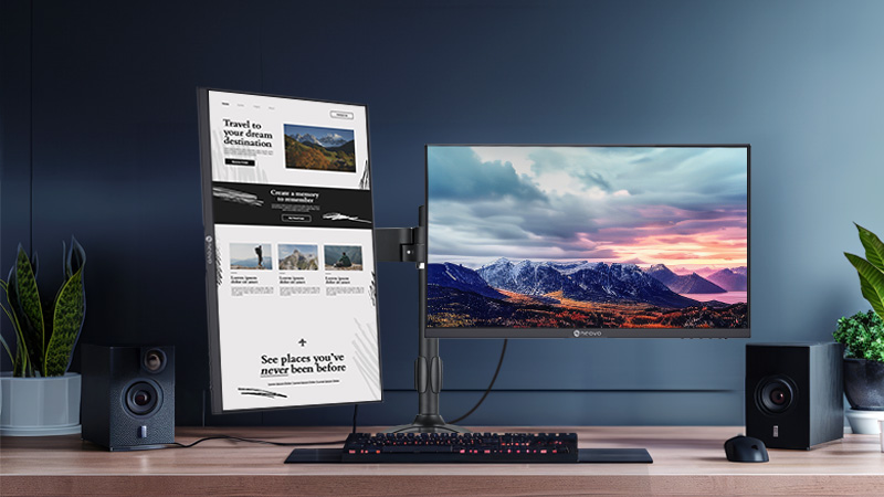 旋轉螢幕能夠提供不同的顯示方向:橫式和直立,進一步提升休閒娛樂與工作成果。專業人士可以根據不同的需求調整螢幕方向,例如:將主螢幕打橫式瀏覽多視窗網頁,副螢幕則調整成直立式閱讀一整頁的程式碼。