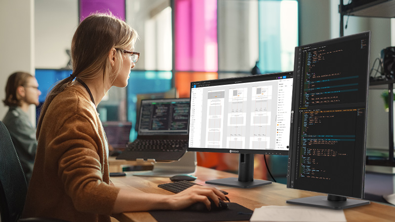 對於需要長時間處理大量工程文件或編輯程式碼的專業人士來說,將顯示器螢幕 90° 翻轉至直立狀態,搭配內容顯示方向設定成直立顯示模式,更能提供絕佳的閱讀和工作體驗。直立螢幕適合閱讀工程規格和編寫程式碼等專業人士,因為將螢幕翻轉後,能夠一次呈現更多的文字及編碼。