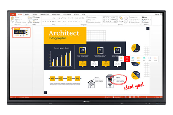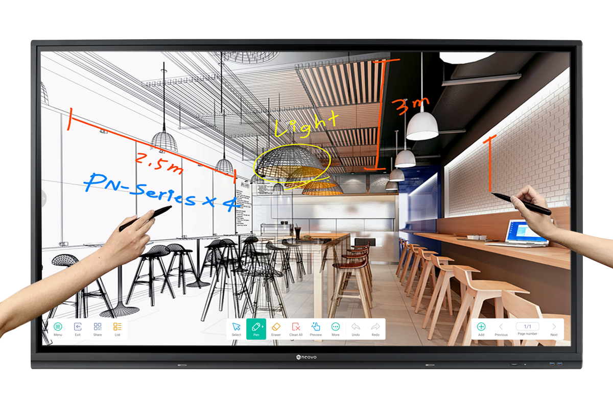 AG Neovo Meetboard 商用互動式電子白板提供隨選及用的註解小工具,能夠以更少的學習曲線提供此功能。透過點選側邊欄輔助選單,即以手指或雙頭觸控筆直接在網頁、圖片、多媒體影音或其他文件格式上繪圖和註記。你可以選擇不同的顏色和畫筆粗細,在螢幕上直觀地呈現想法。
